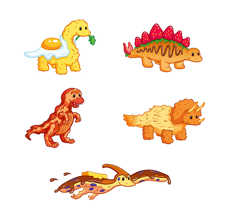 Dinosaurs made out of breakfast food, created in Illustrator.